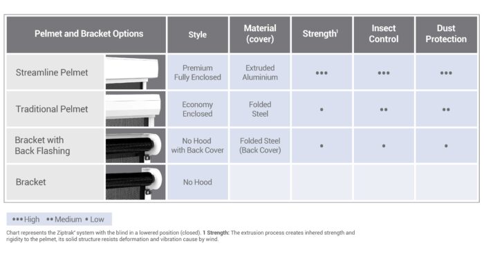 A pelmet encloses and protects the system from weather and creatures, ensuring your blinds will look great and operates effortlessly for years. Highly recommended for blinds installed outside of the structure.